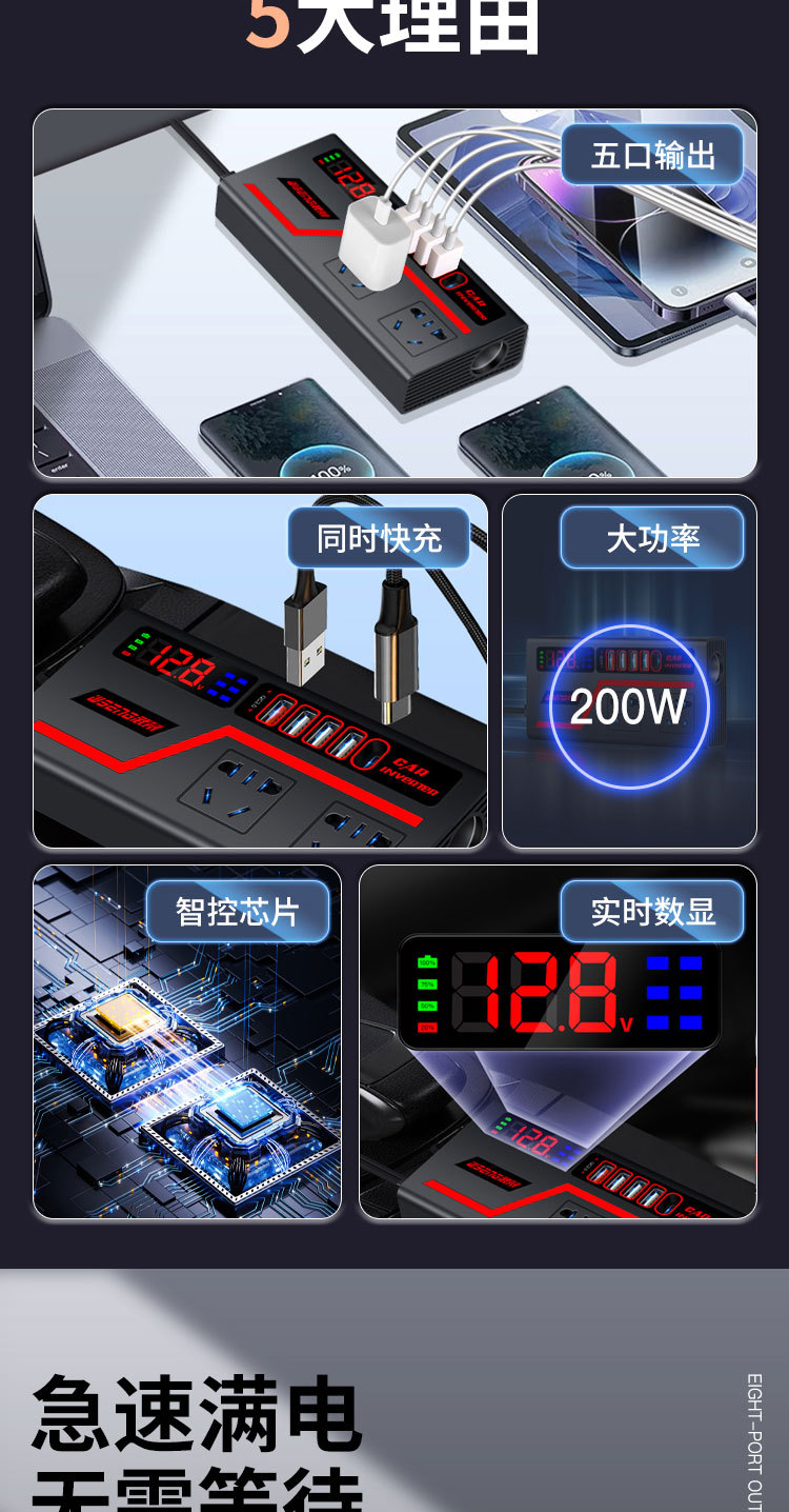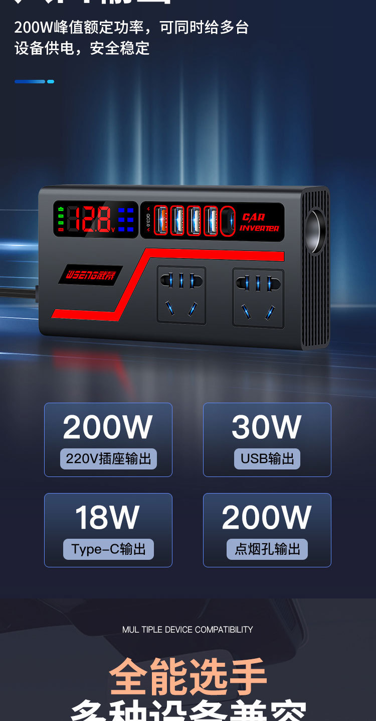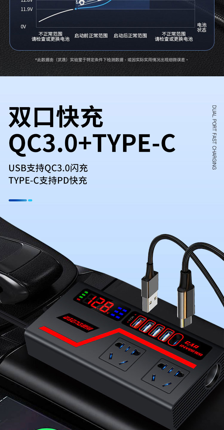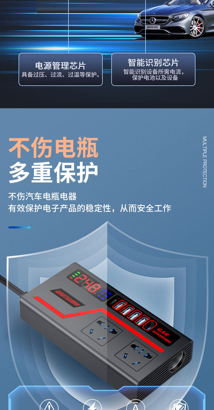 交流车载逆变器12V24V通用转220V大功率智能汽车逆变转换器充电器