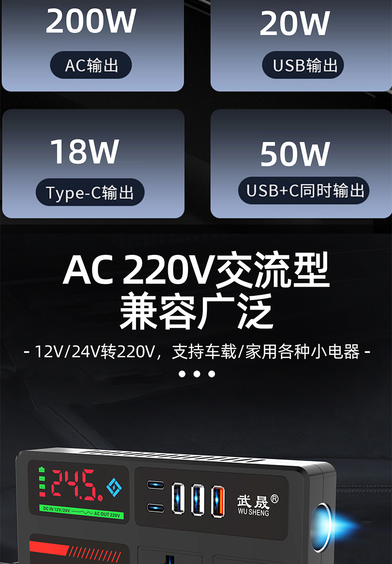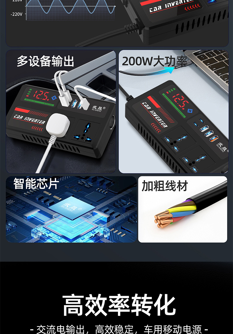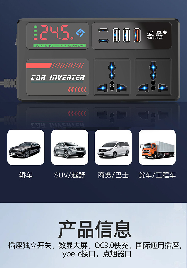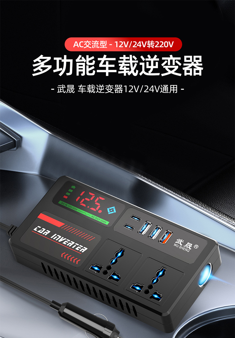 交流车载逆变器12V24V通用转220V大功率智能汽车逆变转换器充电器