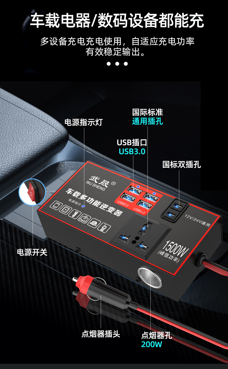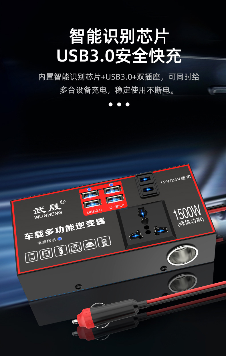 车载逆变器12V24V通用转220V大功率智能汽车逆变转换器手机充电器